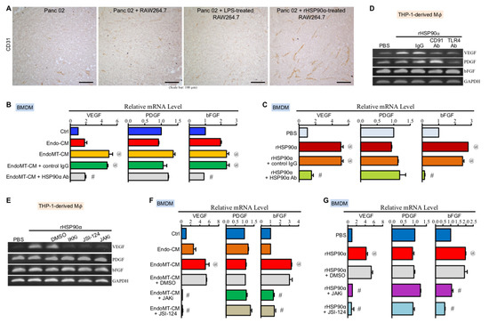 The MyD88–JAK2/TYK2–STAT-3 axis is involved in eHSP90α-induced proangiogenic activity of M2-type macrophages. (A) IHC of CD31 from the tumors formed by Panc 02 cells alone or Panc 02 cells mixed with PBS-, LPS-, or rHSP90α-treated BMDMs. (B) mRNA levels of VEGF, platelet-derived growth factor (PDGF), and bFGF in the BMDMs treated for 24 h with control medium (Ctrl), Endo-CM, EndoMT-CM, or EndoMT-CM plus control IgG or anti-HSP90α antibody. The mean ± SD of qPCR data were obtained from three independent experiments. @ p < 0.01 when compared with “Ctrl” group. # p < 0.01 when compared with “EndoMT-CM + control IgG” group. (C) mRNA levels of VEGF, PDGF, and bFGF in the BMDMs treated for 24 h with PBS, rHSP90α, or rHSP90α plus control IgG or anti-HSP90α antibody. The qPCR data shown are the mean ± SD of three independent experiments. @ p < 0.01 when compared with “PBS” group. # p < 0.01 when compared with “rHSP90α + control IgG” group. (D) mRNA levels of VEGF, PDGF, and bFGF in the THP-1-derived macrophages treated for 24 h with PBS, rHSP90α, or rHSP90α plus control IgG or anti-CD91 or TLR4 antibody. The representative RT-PCR data of three independent experiments are shown. (E) mRNA levels of VEGF, PDGF, and bFGF in the THP-1-derived macrophages treated for 24 h with PBS, rHSP90α, or rHSP90α plus DMSO, IKKi, JSI-124, or JAKi. The RT-PCR data shown are the representative of three independent experiments. (F) mRNA levels of VEGF, PDGF, and bFGF in the BMDMs treated for 24 h with control medium (Ctrl), Endo-CM, EndoMT-CM, or EndoMT-CM plus DMSO, JAKi, or JSI-124. The qPCR data shown are the mean ± SD of three independent experiments. @ p < 0.01 when compared with “Ctrl” group. # p < 0.01 when compared with “EndoMT-CM + DMSO” group. (G) mRNA levels of VEGF, PDGF, and bFGF in the BMDMs treated for 24 h with PBS, rHSP90α, or rHSP90α plus DMSO, JAKi, or JSI-124. The qPCR data shown are the mean ± SD of three independent experiments. @ p < 0.01 when compared with “PBS” group. # p < 0.01 when compared with “rHSP90α + DMSO” group.