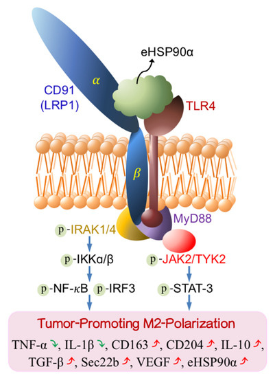 Schematic summary of eHSP90α-induced CD91 and TLR4-associated signal transduction pathways for tumor-promoting M2-polarization in macrophages. Once macrophages are exposed to eHSP90α, CD91 is enhanced to be physically associated with TLR4 to recruit IRAK1/4 and MyD88. Besides the canonical CD91/MyD88–IRAK1/4–IKKα/β–NF-κB/IRF3 signaling pathway, JAK2 and TYK2 are recruited onto MyD88 to turn on a MyD88−JAK2/TYK2−STAT-3 pathway. Both signaling axes act together leading to downregulation of inflammatory cytokines TNF-α and IL-1β as well as upregulation of M2-associated TGF-β, CD163, CD204, IL-10, and VEGF expressions. Following our previous report that the eHSP90α-induced MyD88−JAK2/TYK2−STAT-3 pathway is involved in a feedforward loop of HSP90α expression and secretion, this signal transduction pathway is also responsible for the induction of Sec22b expression to decrease the phagocytotic activity of macrophages. Green ↓, down-regulated. Red ↑, up-regulated.