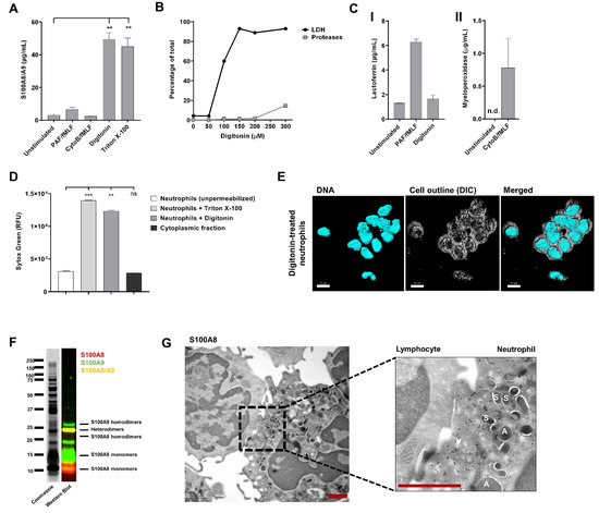 S100A8/A9 is not released during exocytosis. (A) Neutrophils (5 × 105) from healthy controls were left unstimulated or incubated with PAF (1 µM, 5 min) or cytochalasin B (5 µg/mL, 5 min) and subsequently stimulated with fMLF (1 µM) for 10 min at 37 °C. To obtain the cytoplasmic fraction of neutrophils, digitonin (150 µM, 15 min) was used to permeabilize the plasma membrane of neutrophils. As a positive control, neutrophils were permeabilized with Triton X-100 (1%, 10 min). S100A8/A9 concentration was determined by ELISA (n = 4–6, mean + SEM). (B) Experiment to determine the optimal concentration of digitonin to isolate the cytoplasmic fraction. Lactate dehydrogenase (LDH) levels and protease levels were measured and are presented as percentage of their total content (n = 1). (C) Panel I: Lactoferrin concentration in supernatant of unstimulated, PAF/fMLF-stimulated neutrophils, or the cytoplasmic fraction of neutrophils was determined by ELISA (n = 2, mean + SEM). Panel II: Myeloperoxidase concentration in supernatant of unstimulated or CytoB/fMLF-stimulated neutrophils was determined by ELISA (n = 2, mean + SEM). (D) Presence of DNA was measured with Sytox Green Nucleic Acid Stain (n = 3, mean + SEM). (E) Representative image of digitonin-treated neutrophils. DNA was visualized with Hoechst (blue, 405). Images were acquired using a Leica SP8 confocal microscope, magnification 630x, scale bar = 10 µm. (F) Coomassie Brilliant Blue staining and Western Blot for S100A8 (red) and S100A9 (green) of the cytoplasmic fraction of neutrophils. (G) Representative immuno-electron microscopy image of a neutrophil (right) and lymphocyte (left) stained for anti-S100A8 (black dots). Scale bar = 1 µm. “A” indicates azurophilic granules and “S” indicates specific granules. S100A8 is not present in neutrophil granules. Statistics were performed by mixed effects’ model (A) or one-way ANOVA (D) with Dunnett post hoc test; ** p < 0.01, *** p < 0.001, ns = not significant; n.d. = not detectable.