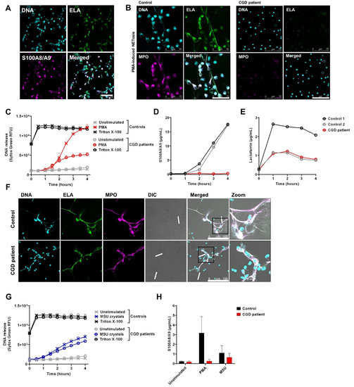 As PMA is a very potent but non-physiological agent, we also induced NET formation by mono-sodium urate (MSU) crystals as found in gout as an inflammatory trigger. Of note, MSU crystals induce NETosis in a ROS-independent manner [33], indicating that CGD neutrophils are able to form NETs per se (Figure 2F,G). Again, we observed that S100A8/A9 is released in conditions when NETs are formed (Figure 2H).