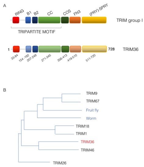 In mammals, TRIM subgroup I is composed of six evolutionarily close members that present orthologous genes in vertebrate species but that are represented only by a single ancestral homologue in invertebrate (Figure 1B) [,]. The TRIM36 protein shares the classic TRIM subgroup I domain composition and is 728 amino acids long in humans (UniProt Q9NQ86) (Figure 1A). It was first identified in 2003 in mouse and named Haprin (from the haploid germ cell-specific RBCC protein) in a haploid germ cell specific cDNA library of mouse testis []. The human ortholog, RBCC728/TRIM36, of the Haprin gene was then identified and mapped on chromosome 5q22.3 []. From hereafter, we will use the name TRIM36 for this family member.