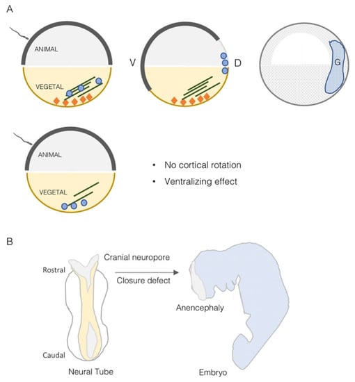 Xenopus embryos derived from fertilization of oocytes injected with antisense oligos against trim36 develop normally until gastrulation but show delay in blastopore lip formation []. At the completion of gastrulation, the majority of them failed to form neural plates. By the early tailbud stages, trim36-depleted embryos were either radially ventralized, in the extreme cases, or formed partial axes lacking anterior structures in the less severe cases. Trim36-depleted embryos were shown to lack well-formed neural tubes, somites and notochords, in some cases forming unorganized lumps of somite tissue in the midline occupying the notochord left space. This defective dorsal tissue formation is possibly exerted along with β-catenin likely by acting upstream or in parallel to Wnt/β-catenin activation []. As detailed in the previous section, trim36 is implicated in maintaining proper organization of the egg vegetal microtubular array that is necessary for cortical rotation to occur. In amphibian fertilized eggs, indeed, axial determination requires a dorsally directed rotational movement of the egg cortex, cortical rotation, at the first cell cycle, and which is driven by a parallel array of microtubules beneath the cortex, transporting dorsalizing factors to the dorsal side of the gastrula [] (Figure 3A). Cortical rotation mediated by trim36-organized microtubule array is thus required to specify the dorso–ventral axis and induce dorsal structures and this action necessitates integral E3 ubiquitin ligase activity, although the molecular targets are still unknown [] (Figure 3A).