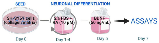 Cells were not cultured beyond passage 20. In our neuronal differentiation protocol (Figure 1), 5 × 104 cells/well were seeded in normal collagen matrix coated plates (NC-100 µg/mL). After 24 h (day 1), the medium was replaced with FBS reduced to 2% (differentiation medium), and supplemented with 10 µM all-trans retinoic acid (RA, Sigma Aldrich, Saint Louis, MO, USA). Cells were incubated for 5 days, with daily medium replacement, except for the second day. On day 5 of differentiation, cultures were stimulated with serum-free medium supplemented with human brain-derived neurotrophic factor (BDNF 50 ng/mL—R&D Systems, MN, USA). On day 7 of differentiation, neurons were used in the experiments [16,17].