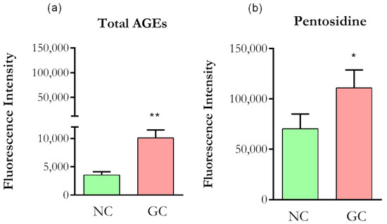 Autofluorescence of collagen. (a) Optical density (DO) values were taken from 370/440 nm for Total AGEs. (b) DO values were taken from 328/378 nm for Pentosidine. NC (normal collagen), GC (glycated collagen). Data were analyzed by t-test, * p < 0.01; ** p < 0.001). Five independent and similar assays were performed in triplicate.