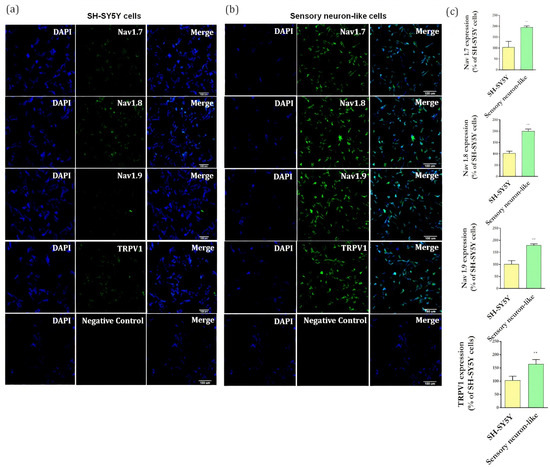 (a) Representative images of immunofluorescence of Nav1.7, Nav1.8, Nav1.9, and TRPV1 markers in undifferentiated cells (SH-SY5Y cells) and (b) in differentiated cells (sensory neuron-like cells). Magnification: 20×. Negative controls of immunostaining. Scale bar: 100 µm. (c) Quantification of Nav1.7, Nav1.8, Nav1.9, TRPV1 expression representing the ratio between the immunostaining in the differentiated cells (sensory neuron-like cells) and the in undifferentiated cells (SH-SY5Y cells). The data were analyzed by t-test, ** p < 0.001). The data represent three independent and similar assays.
