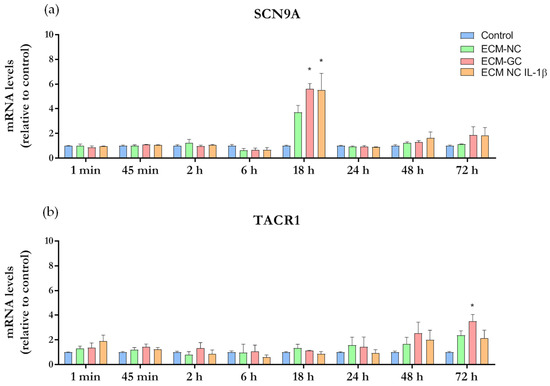Nav1.7 and NK1 receptors ligand are involved in the induction and maintenance of pain state. The results presented in Figure 9a show that ECM-GC and IL-1β significantly increased SCN9A gene expression at 18 h incubation, when compared to control. Of interest, the incubation of neuron-like cells with ECM-GC, but not with ECM-NC plus IL-1β, upregulated TACR1 expression at later stages (72 h) of the study (Figure 9b), indicating that these neurons become hypertensive along the time.