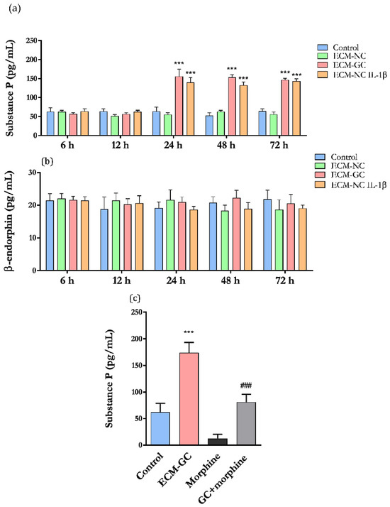 Considering that substance P is a neurotransmitter highly expressed in the primary sensory neurons and leads to neurogenic inflammation [25], we functionally characterized the effect of ECM-GC by evaluating the neuropeptide release. As shown in Figure 11a, substance P secretion is significantly increased in neurons incubated with ECM-GC as well as ECM-NC plus IL-1β, from 24 to 72 h, compared to the control.