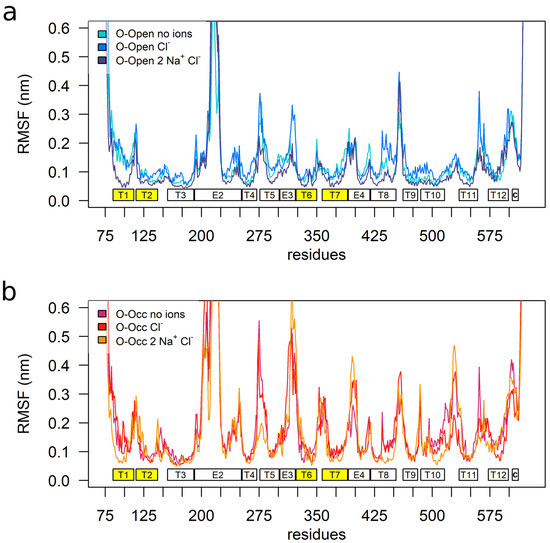 The dynamics of the human serotonin transporter (hSERT). Simulations starting from the O-Occ cryo-EM structure showed higher fluctuations as compared to the simulations starting from the O-Open structure. Root-mean-square fluctuation (RMSF) plots showed the mobility of Cα atoms of (a) the O-Open and (b) O-Occ conformations and their dependences on the bound ions, averaged over five independent parallel runs with a 1 ns temporal resolution.