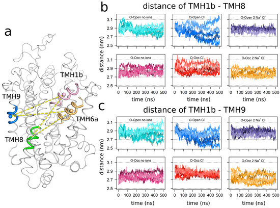 Bound ions stabilize transmembrane helix 1b (TMH1b). (a) Graphical legend highlighting the measured distances. The center of mass of TMH1b (residues 99–111), TMH6a (residues 328–338), TMH8 (residues 442–450), and TMH9 (residues 471–477) were used for measurements. These are highlighted as spheres. The time evolutions of the distances between TMH1b and TMH8 (b) and between TMH1b and TMH9 (c) are shown. All data were sampled with a 1 ns temporal resolution. The respective distances from TMH6a are shown in Supplementary Figure S1.