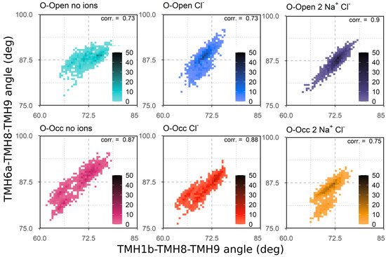 Ion dependences of the correlated motions of TMH1b and TMH6a. The angles between the center of mass of TMH1b–TMH8–TMH9 and TMH6a–TMH8–TMH9 are shown as two-dimensional (2D) histograms. The last 250 ns of 5 parallel simulations with a 1 ns temporal resolution were used. Angles are measured in degrees (deg). Pearson correlation coefficients (corr) are reported at the upper right corner of each plot.