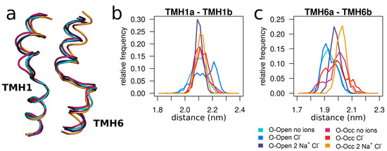 The binding of the three ions reduced the overall and internal motions of the bundle domain in the O-Open state and the O-Occ state (Figure 1). These changes had a strong ordering effect on the relative distances between TMH1a (residues 86–95) and TMH1b and between TMH6a and TMH6b (residues 343–350) (Figure 4). The distribution of distances became narrower in the presence of Na+, visible by sharper and higher peaks in the distributions (the Levene’s test result for variance homogeneity is shown in Supplementary Table S1). Interestingly, while the centers of the distributions overlapped for TMH1 (Figure 4b), the binding of all three ions shifted the separation between TMH6a and TMH6b to a narrower distribution and to larger values as compared to the respective apo- and the Cl—only-bound states (tested by one-way ANOVA for all groups using the last 250 ns of simulations; p = 1.31 × 10−5).