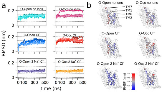 Internal motions of the bundle domain. The internal mobility of the bundle domain decreased, if in the O-Open state and in complex with one Cl− and two Na+ ions: (a) root-mean-square deviation (RMSD) of the bundle domain after fitting the trajectories to the bundle domain using a 1 ns temporal resolution; (b) RMSF of the bundle domain (after fitting to the bundle domain), projected to the mean structure and color coded by the magnitude of fluctuations.