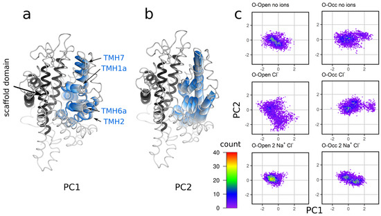 Principal component analysis indicates the reduced dynamics of the bundle domain. Visualization of the hSERT movements captured by principle component 1 (PC1) (a) and PC2 (b) shown as a series of intermediate conformations interpolated between the two most extreme conformations observed in the simulation of the O-Open Cl−-bound system. (c) Projection of the motions of the hSERT onto PC1 and PC2. The motions of the bundle domain (Cα atoms) were analyzed after fitting to the scaffold domain. The analysis included all trajectories with a time resolution of 1 ns. PC1 described 39% of the total variance, and PC2 described 20% of the total variance.