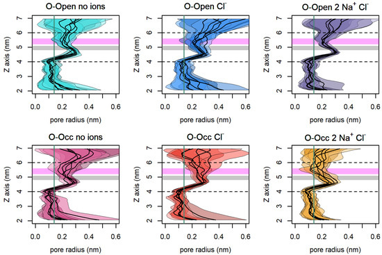 The stabilization of an open outer vestibule was important for the binding of the substrate and co-transported ions to the S1. We measured the mean radius and the fluctuation of the vestibule size along the z-axis to estimate the accessibility of the S1 using the HOLE program (Figure 7), which allowed for the quantification of the size of pores in protein structures using a radial measure. The dashed horizontal lines indicate the bottom of the S1 (at 4 nm) and the entry to the outer vestibule (at 6 nm). The aquamarine vertical line indicates the radius of a water molecule (0.14 nm), which serves to indicate a complete closure of the passage. Consistent with previous measures, Figure 7 shows that the O-Open hSERT in complex with Na+ and Cl− maintained the most widely open outer vestibule and showed the lowest fluctuations of the outer vestibule. The conformational stability of the open conformation was highlighted by the low amplitude of motions at the hydrophobic gate and the extracellular salt bridge (R104-E493), which are highlighted as gray and magenta areas, respectively.