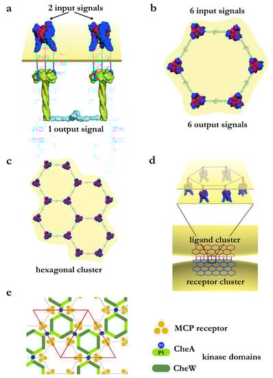 - Briegel, A.; Li, X.; Bilwes, A.M.; Hughes, K.T.; Jensen, G.J.; Crane, B.R. Bacterial chemoreceptor arrays are hexagonally packed trimers of receptor dimers networked by rings of kinase and coupling proteins. Proc. Natl. Acad. Sci. USA 2012, 109, 3766–3771. [Google Scholar] [CrossRef] [PubMed]