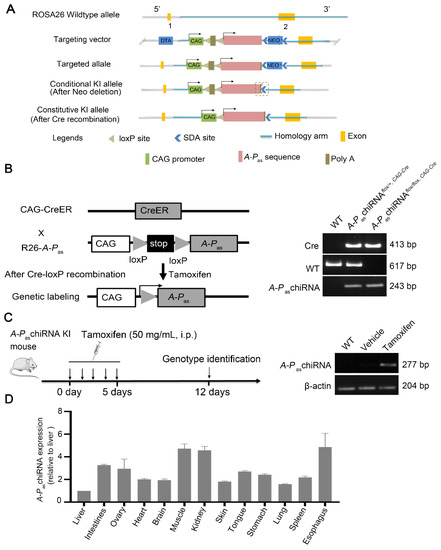 2.1. Establishment and Characterization of A-PaschiRNA Conditional Knockin Model