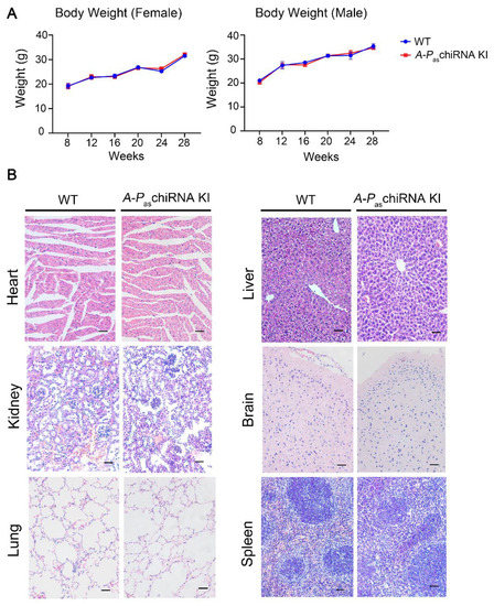 Body weight and major organs in WT and A-PaschiRNA KI mice. (A) Body weight of WT and A-PaschiRNA KI mice was measured weekly for 20 weeks. Body weight of female (n = 3 per group; left panel) and male mice (n = 3 per group; right panel) did not differ significantly between two groups. (B) HE staining of major organs (i.e., heart, kidney, lung, liver, brain, and spleen). Scale bar: 50 μm.