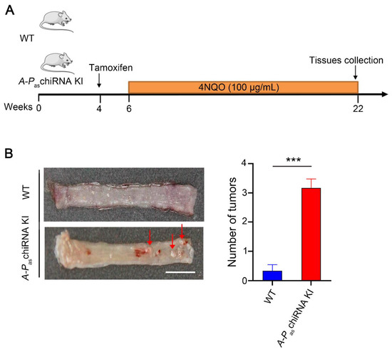 4NQO-induced ESCC tumors in WT and A-PaschiRNA KI mice. (A) The protocol of chemical-induction of ESCC in WT and A-PaschiRNA KI mice. Mice were given 4NQO (100 μg/mL) in drinking water for 16 weeks. (B) The left panel demonstrates the gross anatomy of the representative esophagus from WT and A-PaschiRNA KI mice. Red arrows indicate esophageal tumors. The number of tumors per mouse in the esophagus from WT and A-PaschiRNA KI mice was shown in the right panel. n = 6 per group; *** p < 0.001; Scale bar: 5 mm.