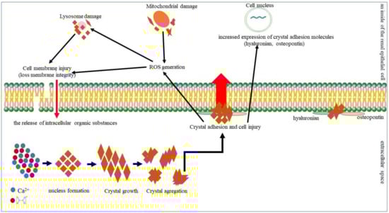 In supersaturated urine, calcium and oxalate combine to form initially microscopic insoluble crystals. This is the first stage of deposit formation (nucleus formation). Then, individual microcrystals combine into larger forms (crystal growth), which, in turn, can aggregate together to form large, stable deposits (crystal aggregation) [34,35]. In the next stage, the crystals interact with the cells of the renal tubular epithelium. Crystal–cell interaction causes the movement of crystals from the basolateral side of cells to the basal membrane [36]. Injured cells release substances such as the kidney fragment of prothrombin−1 or other anionic proteins that induce crystal agglomeration [37]. Moreover, injured cells can invert their cell membrane, which is anionic to the urinary environment and acts as a place of crystal adhesion. The inverted cell membrane makes it easy for other crystals to attach [38]. Exposure to calcium oxalate crystals induces oxidative stress in renal epithelial cells. In addition, calcium oxalate influences the composition and function of the renal epithelial cell membrane. Calcium oxalate crystals destroy tight junctions and the polarity of the cell membrane that carries the components of the basolateral or tight junction region to the apical surface of the cell, which, in turn, leads to rupture of the cell membrane and the release of intracellular organic substances. Damaged tubular epithelial cells also show increased expression of crystal adhesion molecules such as hyaluronan, osteopontin, and CD44, which promote crystal adhesion and retention. Endocytosed crystals adversely affect mitochondrial function, causing abnormality in the respiratory chain and increasing the mitochondrial production of reactive oxygen species (ROS), which may damage, and induce apoptosis of, renal epithelial cells [39].