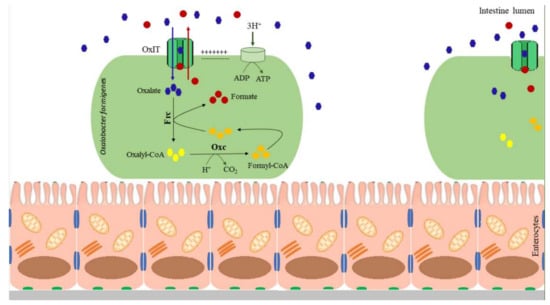 The ability of O. formigenes to metabolize oxalate may be attributed to the presence of two enzymes, i.e., formyl-CoA-transferase and oxalyl-CoA-decarboxylase. O. formigenes takes up oxalate via the OxIT transporter encoded by the OxIT. This transport relies on the extracellular uptake of oxaloacetate in return for the formate released from the cell. In bacterial cells, formyl-CoA transferase (encoded by fcr) activates the oxalate by adding coenzyme A molecules with the formation of oxalyl-CoA. Then, oxalyl-CoA is decarboxylated by oxalyl-CoA decarboxylase (encoded by oxc). The oxalyl-CoA decarboxylase produces CO2 and formate, which are used by OxIT to transport oxalate. Oxalate decarboxylation generates a proton pump gradient that induces ATP production, coupling with oxalate–formate transport [46]. Oxalate metabolism is presented in Figure 2.