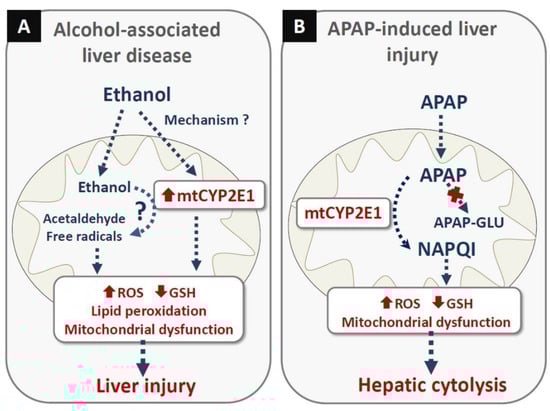Possible role of mitochondrial CYP2E1 in hepatotoxicity induced by ethanol abuse and acetaminophen intoxication. (A) In alcohol-associated liver disease, mitochondrial CYP2E1 (mtCYP2E1) could be involved by two different mechanisms. First, ethanol intoxication increases mtCYP2E1 levels, which can induce reactive oxygen species (ROS) overproduction, Second, mtCYP2E1 might contribute to the generation of acetaldehyde and free radicals such as the 1-hydroxyethyl and hydroxyl radicals. ROS, and possibly acetaldehyde and free radicals, cause reduced glutathione (GSH) depletion, lipid peroxidation and mitochondrial dysfunction. Altogether, these deleterious events contribute to ethanol-induced liver injury. (B) In acetaminophen (APAP) intoxication, mtCYP2E1 generates N-acetyl-p-benzoquinone imine (NAPQI), a highly reactive metabolite inducing ROS overproduction, depletion of GSH and major mitochondrial dysfunction, which causes massive hepatic cytolysis. The lack of UDP-glucuronosyltransferases in mitochondria does not allow the generation of APAP-glucuronide (APAP-GLU), which is a non-toxic APAP metabolite. Importantly, the involvement of mtCYP2E1 in alcohol and APAP-induced hepatotoxicity does not exclude the role of extramitochondrial CYP2E1 in ROS overproduction and reactive intermediate generation.
