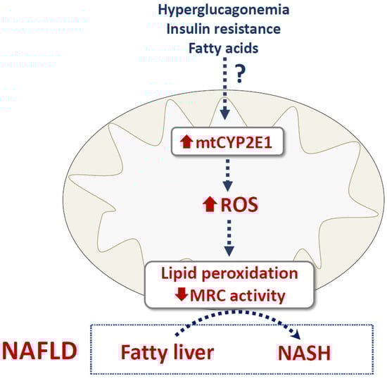 Hypothetical scheme regarding regulation and role of mitochondrial CYP2E1 in nonalcoholic fatty liver disease. In nonalcoholic fatty liver disease (NAFLD), different factors might favor CYP2E1 targeting to mitochondria including hyperglucagonemia, insulin resistance and some fatty acids. Higher levels of mitochondrial CYP2E1 (mtCYP2E1) might then secondarily cause reactive oxygen species (ROS) overproduction, which in turn triggers local lipid peroxidation and decreased activity of the mitochondrial respiratory chain (MRC). Of note, impaired MRC activity enhances ROS production, thus creating a vicious circle (not shown). In NAFLD, ROS and lipid peroxidation are deemed to play a key role in the transition of simple fatty liver to nonalcoholic steatohepatitis (NASH). Importantly, mtCYP2E1 involvement in NAFLD does not exclude the role of microsomal CYP2E1 in ROS overproduction, lipid peroxidation and mitochondrial dysfunction.