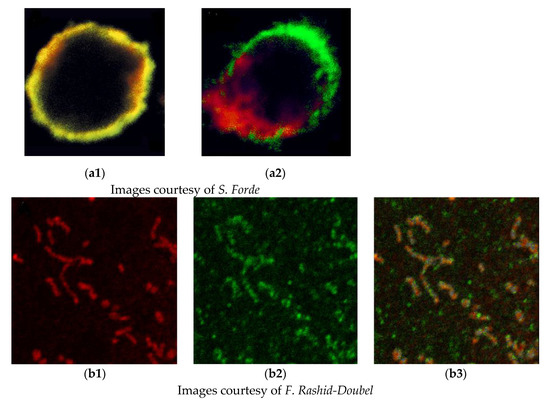 One of the common objectives of the simultaneous detection of two or more antigens is to identify colocalization and thus coexpression. Unfortunately, initially, there was a widespread misunderstanding of the commonly used parameters of colocalization, and we sought to provide support and software to allow objective analysis. We recognised that colocalization based on the appearance of a yellow signal caused by the overlap of green and red signals or even correlation coefficients was inadequate and possibly misleading. To quantify the colocalization of fluorescent probes, the objective method of Costes et al. [10] was implemented using specialised software. This involves considering the point spread function of the microscope and the elimination of signal noise by a statistical method. This is still a topic of misunderstanding, and a recent review [11] provides useful guidance. Two examples showing the potential pitfalls in just using yellow signals to identify the association of antigens are given in Figure 1.