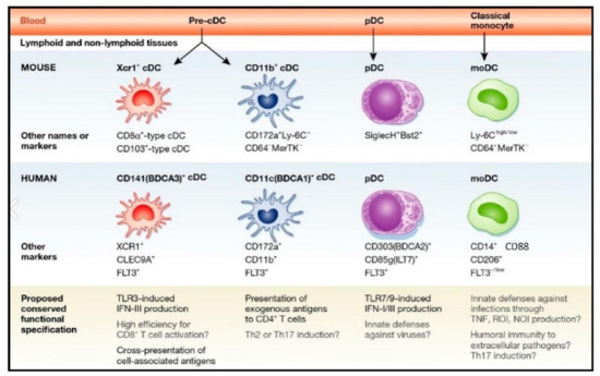 - Anderson, D.A.; Dutertre, C.A.; Ginhoux, F.; Murphy, K.M. Genetic models of human and mouse dendritic cell development and function. Nat. Rev. Immunol. 2021, 21, 101–115. [Google Scholar] [CrossRef]