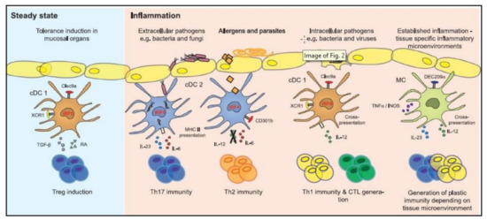 Diagram showing the functional characteristics of cDC subsets and monocyte-derived cell subsets in terms of their capacity to activate T cells during inflammation and the steady state. Reproduced with permission from [49]. Copyright 2015, Elsevier.