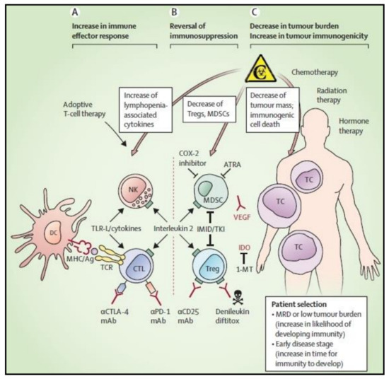 Multimodal techniques to enhance DC-based immunotherapy’s therapeutic effectiveness. DC-based cancer therapies aim to take use of DCs inherent ability to activate antitumor immune effector cells, such as natural killer cells and cytotoxic T lymphocytes that are specific to the tumor antigen. Dendritic cell therapy is being actively pursued in conjunction with therapeutic approaches that seek to strengthen the immune effector response (A), reverse cancer-associated immunosuppression (B), or reduce the tumor burden and raise the immunological susceptibility of the tumor cells (C). Reproduced with permission from [92]. Copyright 2014, Elsevier.