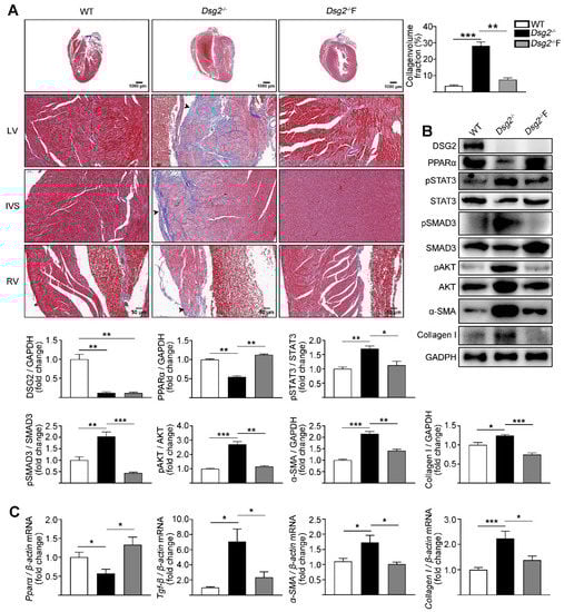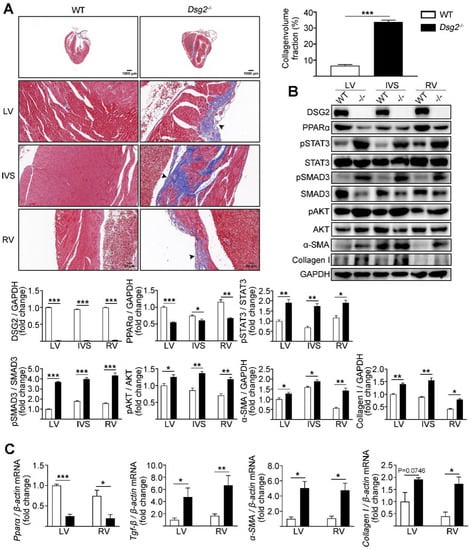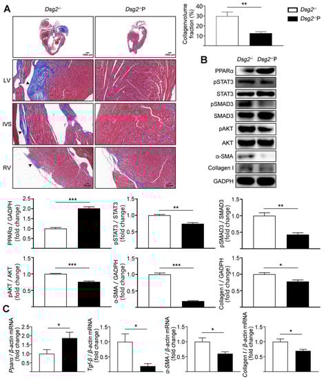 ACM is characterized by progressive replacement of cardiomyocytes by fibro-fatty tissue, cardiac dysfunction, ventricular arrhythmias, and heart failure. Mutation of desmoglein-2 (Dsg2) is one of the major causes of ACM and has been shown to lead to a loss of adhesive function []. Dsg2 mutation carriers display more severe heart muscle disease, which is associated with biventricular involvement and rapid evolution to end-stage heart failure []. In our previous study, we generated an ACM mouse model by cardiac-specific knockout of the DSG2 gene and discovered that downregulation of PPARα contributed to the impairment of fatty acid oxidation and, thus, to lipid accumulation in the DSG2 deletion-induced ACM []. However, whether downregulation of PPARα also contributes to the fibrosis in ACM was unsolved. In the present study, we uncovered a previously unrecognized role of PPARα in cardiac fibrosis in Dsg2-deficient ACM mice. Cardiac-specific Dsg2 knockout contributed to a severe cardiac fibrosis. Decreased expression of PPARα and the increased phosphorylation of STAT3 and SMAD3 were observed in this model. Moreover, activation of PPARα, either by fenofibrate or AAV9-Pparα, decreased the activity of STAT3 and SMAD3 and improved cardiac fibrosis in Dsg2 deletion-induced ACM.