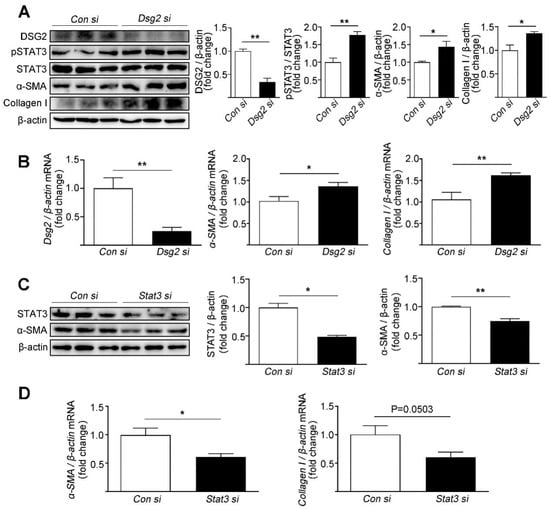 Effects of Dsg2 siRNA and Stat3 siRNA on the expression levels of fibrotic markers in HL-1 cells. (A,B) HL-1 cells were transfected with control siRNA or Dsg2 siRNA. (A) Representative Western blots for DSG2, pSTAT3, α-SMA, and Collagen I were detected using specific antibodies. STAT3 and β-actin were used as loading controls. (B) Results of quantitative PCR analysis of Dsg2, α-SMA, and Collagen I mRNA levels in HL-1 cells treated with control or Dsg2 siRNA are expressed as fold change of control using β-actin as loading control. Results are expressed as mean values ± SEM. n = 3. * p < 0.05, ** p < 0.01 vs. control. (C,D) HL-1 cells were transfected with control siRNA or Stat3 siRNA. (C) Representative Western blots for STAT3 and α-SMA were detected using specific antibodies. β-actin were used as loading controls. (D) Results of quantitative PCR analysis of α-SMA and Collagen I mRNA levels in HL-1 cells treated with control or Stat3 siRNA are expressed as fold change of control using β-actin as loading control. Results are expressed as mean values ± SEM. n = 3. * p < 0.05, ** p < 0.01, vs. control.