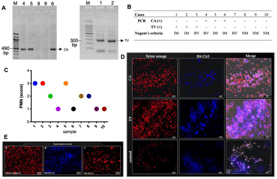 Diagnosis and characterization of vaginal discharges. (A) Representative images of the PCR results for the samples of vaginal discharges with CA and TV. (B) The results of each case in the PCR diagnosis and the classification according to Nugent’s criteria (NM, normal microbiota; IM, intermediate microbiota; BV, bacterial vaginosis). (C) The score for the presence of neutrophils in each vaginal discharge (pathological and controls), with 1 indicating scarce, 2 indicating moderate, and 3 indicating abundant. (D) Representative images of epifluorescence microscopy showing neutrophil infiltration in vaginal discharges for CA, TV, and control group. Red indicates DNA (Sytox Orange) and blue indicates H4cit3; the merge was done in a bright field. Images in (E) show experimental controls: (a) Sytox-orange-positive cells, (b) H4cit3-positive cells, and (c) H4cit3-negative cells (without primary antibody). The images were taken at 20× magnification.