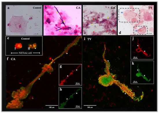 NETs were present in all vaginal samples with CA- and TV-induced vaginitis (Figure 1D) as well as in the control group. Labeling of H4cit3 attached to extracellular DNA confirmed the process of NETosis (Figure 1D). In addition, the visualization of NE on the released extracellular chromatin structures corroborated the presence of NETs (Figure 2e,f,h,i,k). The samples diagnosed via PCR as CA infections presented pseudohyphae that were easily visualized using Gram staining (Figure 2b,c). In the samples obtained from patients diagnosed with TV-induced vaginitis, the extracellular parasite stages (i.e., trophozoites) were visualized with Gram staining (Figure 2d). Different visual findings in the samples with CA- and TV-induced vaginitis indicated the release of NET-derived strands from PMN that were connected to adjacent cells (Figure 2f) and cells completing NETosis with total loss of DNA at the intracellular level (Figure 2).