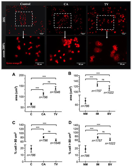 Nuclear PMN analysis of pathological vaginal discharges. The microscopic images show nuclear staining with Sytox Orange (red fluorescence) at 20× and 200× magnification. Graphs in (A) and (B) show average sizes of the cells analyzed in µm2 grouped into discharges diagnosed as CA and TV and classified according to characteristics of the microbiota, respectively. Graphs in (C,D) show percentages of cells with nuclei greater than 80 µm2 grouped according to pathology and microbiota, respectively. The data are indicated as mean ± SD; the total number of analyzed cells in each column is indicated (*** p < 0.001).