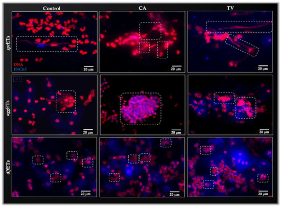 Representative images of CA- and TV-positive vaginal discharges and control (c) presenting NETs in their different morphologies. In all the images, red indicates DNA stained with Sytox Orange and blue indicates stained citrullinated histone (H4Cit3). The outline in white indicates the type of NET that each image represents: sprNETs, “spread”; aggNET, “aggregated”; diffNETs, “diffuse”.