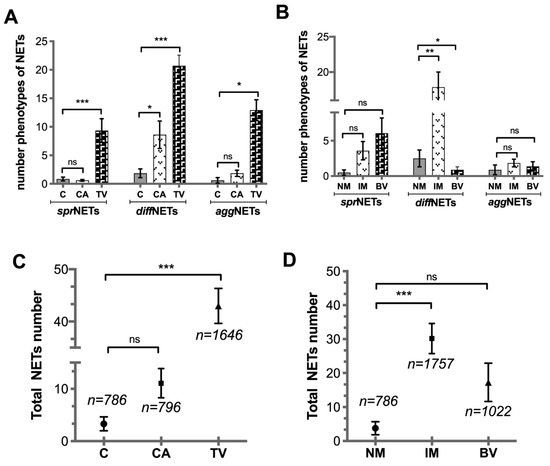 Quantification of the different NET structures. The graph in (A) shows types of NETs in pathological vaginal discharges classified according to the infection (CA and TV) and control (C); the graph in (B) shows the quantification of different types of NETs in groups classified according to microbiota (MN, IM, and BV). The graphs in (C,D) show the total NETs in groups classified according to the type of infection and types of microbiota, respectively. The data are indicated as mean ± SD (* p < 0.05, ** p < 0.01, *** p < 0.001).