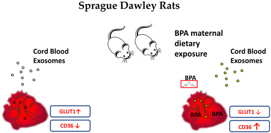 In summary (Figure 5), BPA exposure in prenatal life alters nutrient transporters in the rat fetal heart, causing an increase in fatty acid absorption. If these effects persist into postnatal life, chronic BPA exposure to a high-fat diet could cause cardiac lipid overload and lead to susceptibility to heart failure in adulthood. Furthermore, the data on cord blood exosomes suggest that signals, present probably in exosomes of placental origin, could partially ameliorate the harmful effects of BPA on the rat fetal heart. Thus, we hypothesize that the downregulation of GLUT1 would be more severe were it not for the modulating effects of exosomes.