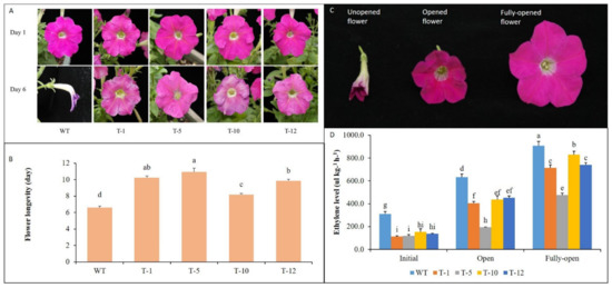 - Huang, L.-C.; Lai, U.-L.; Yang, S.-F.; Chu, M.-J.; Kuo, C.-I.; Tsai, M.-F.; Sun, C.-W. Delayed flower senescence of Petunia hybrida plants transformed with antisense broccoli ACC synthase and ACC oxidase genes. Postharvest Biol. Technol. 2007, 46, 47–53. [Google Scholar] [CrossRef]