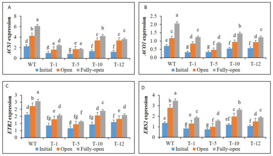 3.2. Expression of Ethylene Biosynthesis and Receptor Genes in Floral Tissues