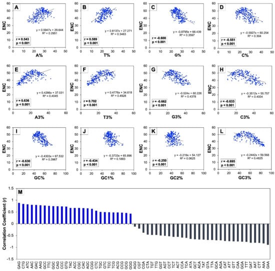 Regression analysis among ENC and various nucleotide composition of human autophagy genes. Scattered regression plots between ENC and individual nucleotide composition (A–D), between ENC and nucleotides at third codon position (E–H), and between ENC and GC contents (I–L) were analyzed. The insets in all the regression plots represent their corresponding correlation coefficients and p values. (M) represents the correlation between codon usage and GC3 across all 224 genes involved in human autophagy.