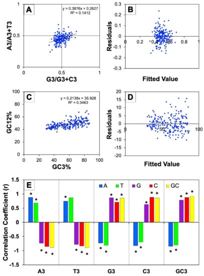 The parity rule 2 bias plot analysis of [A3/(A3+T3)] vs. [G3/(G3+C3)] was conducted to comprehend the relationship among A/T and G/C constituents which was useful for estimating the relative quantity of natural selection and mutational pressure upon the constituent of genes. In the event that mutation pressure acts on the CUB of genes, both nucleotides, namely, AT as well as GC should be equivalently dispersed among the degenerate group of codons. On the contrary, a disproportionate use of AT and GC suggests that both forces such as mutational and selection pressure influence the codon usage bias []. In this study, the mean GC bias was found to be 0.4948 ± 0.0602 and the mean AT bias was 0.4545 ± 0.0622. The observed asymmetrical distribution of the GC and AT indicated that both pressures (mutational and natural selection) affected the CUB genes involved in human autophagy (Figure 4A). Further, the residual analysis of the parity plot showed a random distribution of the points over the straight horizontal line that demonstrated the regression model’s linearity (Figure 4B).