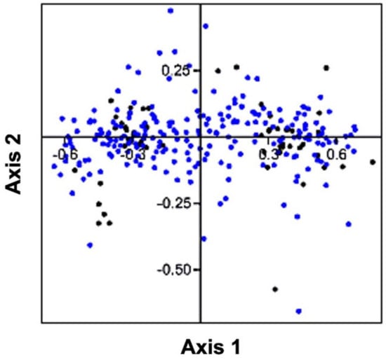 Correspondence analysis (CoA) of human autophagy genes. The CoA is represented by blue and black colored dots designating the genes and their codons, respectively.