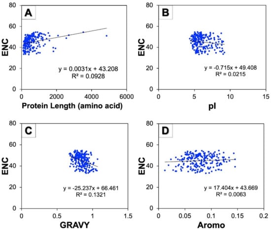 Regression analysis among ENC and various protein properties of human autophagy genes. (A–D) represent the scattered regression plots between ENC and protein length, pI, GRAVY, and Aromo, respectively.