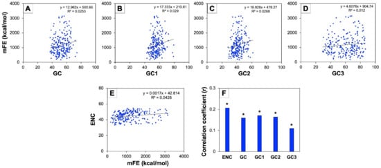 Role of mFE of genes involved in human autophagy on CUB. (A–D) represent the regression plots between mFE and GC contents in all genes. (E) represents the regression plot between ENC and mFE. (F) represents the distribution of the correlation coefficient of mFE against ENC and various GC contents such as overall GC, GC1, GC2, and GC3. For these analyses, absolute values of mFE were considered (* represents p < 0.01).