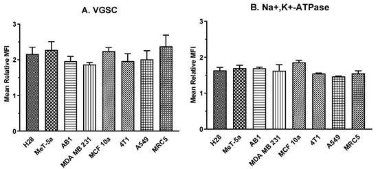 - Roger, S.; Rollin, J.; Barascu, A.; Besson, P.; Raynal, P.-I.; Iochmann, S.; Lei, M.; Bougnoux, P.; Gruel, Y.; Le Guennec, J.-Y. Voltage-gated sodium channels potentiate the invasive capacities of human non-small-cell lung cancer cell lines. Int. J. Biochem. Cell Biol. 2007, 39, 774–786. [Google Scholar] [CrossRef] [PubMed]