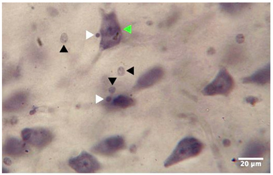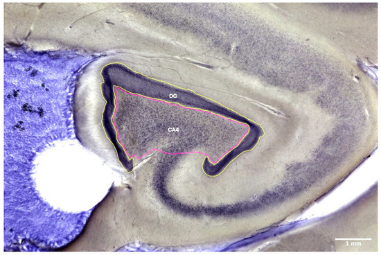 Typical findings in neurons were a large cytoplasm, a less distinct nuclear membrane, a pale nucleus in a clearly visible nucleolus, and a more uniform distribution of nuclear chromatin material. Mature oligodendroglia showed no staining in the cytoplasm, no nucleolus, and pronounced nuclear staining with scattered chromatin. We also included immature oligodendrocytes, which are larger and paler than mature ones [23]. Astrocyte staining was less dense [24,25,26]. In the DG, we focused on the densities and numbers of granule cells (Figure 3).