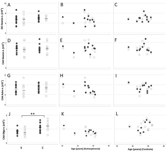 Mean and standard error of the mean (A,D,G,J) and individual values correlated with age (patients with schizophrenia [S]: (B,E,H,K); controls [C]: (C,F,I,L) of the total number of neurons in the hippocampal granule cell layer (the dentate gyrus; DG Neuron n.; (A–C)) and cornu ammonis 4 (CA4 Neuron n.; (D–F)) and of the number of astrocytes (CA4 Astro n.; (G–I)), and oligodendrocytes (CA4 Oligo n.; (J–L)) in postmortem brains from men with schizophrenia and age- and sex-matched controls. Closed dots represent data from left hemispheres, and open dots, data from right hemispheres. ** p < 0.005.