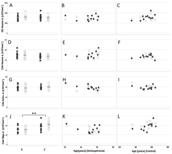 Mean and standard error of the mean (A,D,G,J) and individual values correlated with age (patients with schizophrenia [S]: (B,E,H,K); controls [C]: (C,F,I,L)) of the density of neurons (in 103/mm3) in the hippocampal granule cell layer (the dentate gyrus; DG Neuron d.; (A–C)) and cornu ammonis 4 (CA4 Neuron d.; (D–F)) and of the density of astrocytes (CA4 Astro d.; (G–I)) and oligodendrocytes (CA4 Oligo d.; (J–L)) in postmortem brains from men with schizophrenia and age- and sex-matched controls. Closed dots represent data from left hemispheres, and open dots, data from right hemispheres. ** p < 0.005.