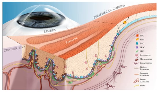 Schematic of the limbal niche. The corneoscleral limbus contains the Palisades of Vogt (PV) and limbal epithelial crypts. The limbal epithelial stem cells (LESCs) are in close contact with niche cells, including melanocytes and mesenchymal stem cells (MSCs) in the limbal epithelial crypts. The basement membranes of the cornea, limbus, and conjunctiva have different constructs, which are in turn necessary for maintaining proper homeostasis. In the basal epithelial layer of the limbal epithelial crypts, the LESCs divide symmetrically into two identical cells (in the horizontal plane) or asymmetrically to give rise to another LESC and a transient amplifying cell (TAC, in both vertical and horizontal planes). Then, TACs divide into postmitotic cells (PMCs) as they migrate centripetally. The PMCs then differentiate into terminally differentiated cells (TDCs) and are shed from the corneal surface.. Abbreviations: LESC, limbal epithelial stem cell, TAC, transient amplifying cell, PMC, post-mitotic cell, TDC, terminally differentiated cell, MSC, mesenchymal stem cell. Reproduced from [].
